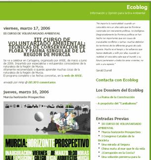Bajo el sugerente lema “información y opinión para la Era Ambiental” se presenta este blog, desde el año 2004, con noticias, iniciativas y diferentes convocatorias interesantes de carácter naturalista como ambiental, así como enlaces de interés, sobre todo con lo que respecta a la región de Murcia. Como dato de interés reseñar el dossier sobre la construcción, problema acuciante en todo el territorio español y en especial en la costa. |